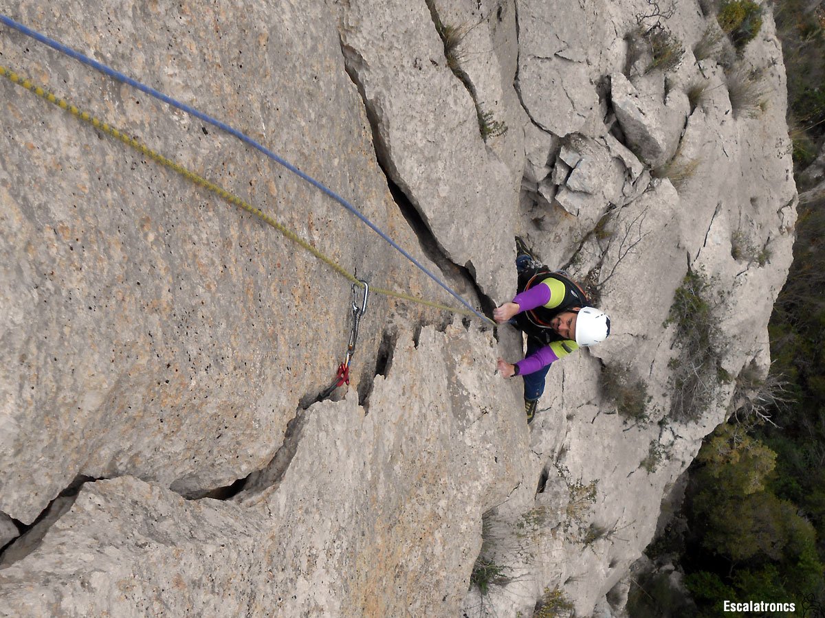 Tots els llargs són bons. El primer té un inici ben bonic, amb una part central una mica bruta i un final en fissura. El segon es troba pràcticament equipat, tot i que podrem posar un tascó petit entre el segon i el tercer parabolt. La tercera tirada té un primer tram de roca deplorable, però ben assegurat. Un cop superat ens queden 20 metres de diversió amb un seguit de fissures genials. La darrera tirada aprofita el darrer pany escalable i encar hi trobarem algun pas divertit. No us deixeu els tascons!!