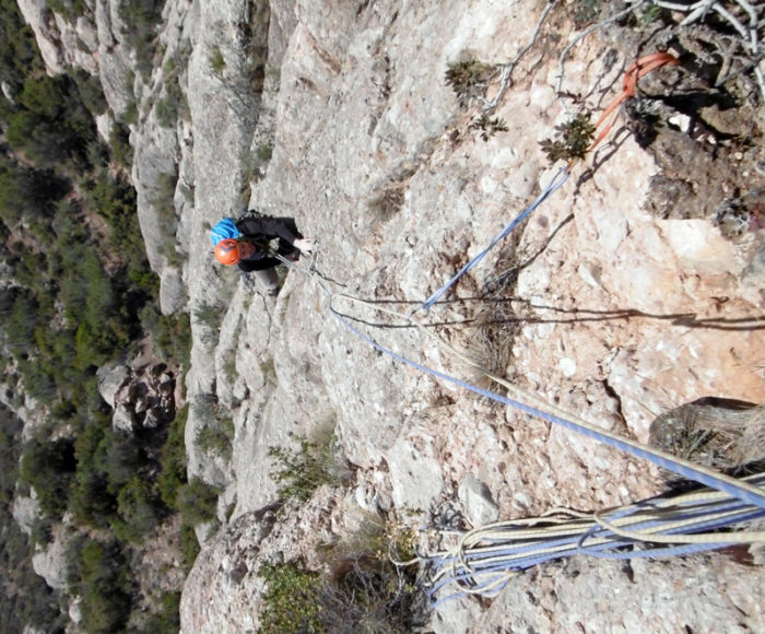 Des de la darrera reunió fem un primer ràpel a la R-9 i d’aquesta a la 7. Des de la R-7 fem un darrer ràpel fins la feixa i la resseguim direcció oest fins a la gran canal. Anem en tendència oest fins trobar unes cordes fixes i d’allí fins a les Coves del Salnitre.