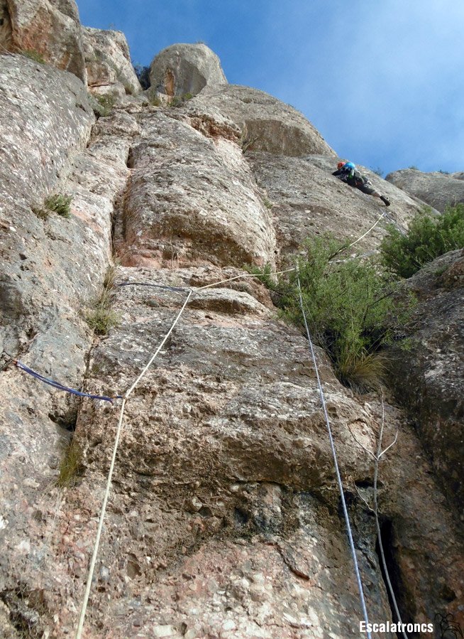 En general la via és mantinguda en V/V+. Tocarà acabar de completar l’equipament a més d’un punt. L’inici de la via el fem aprofitant l’entrada de l’Aranya per de seguida marxar cap a la dreta. Al segon llarg el primer clau no es veu, està a la segona fissura. A la cinquena tirada i sobretot a la sisena trobarem la roca més discreta de la via. Per contra, a partir de la gran feixa el rocam es torna excel·lent. Al darrer llarg, sens dubte el millor, hi falta el segon espit; no obstant es pot protegir bé amb un friend mitjà.