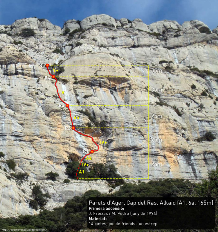 La via es troba uns 20 metres a l’esquerra de la Redrum. El primer clau es troba força amunt, per arribar-hi haurem de fer un pas d’espatlla (com marca la ressenya) o bé enfilar-nos a un arbret. Després d’aquesta primera part d’artificial es surt a una placa (+IV) fins un espit, per continuar en Ae fins la reunió. 25 metres.