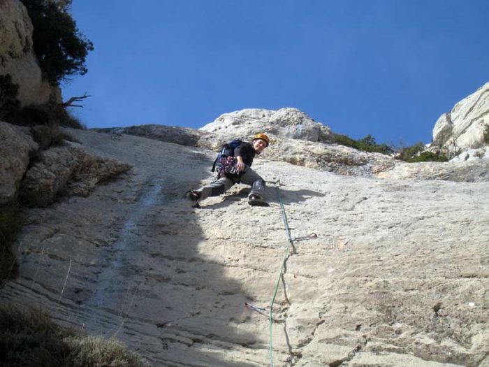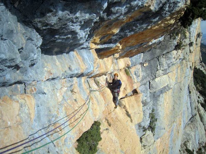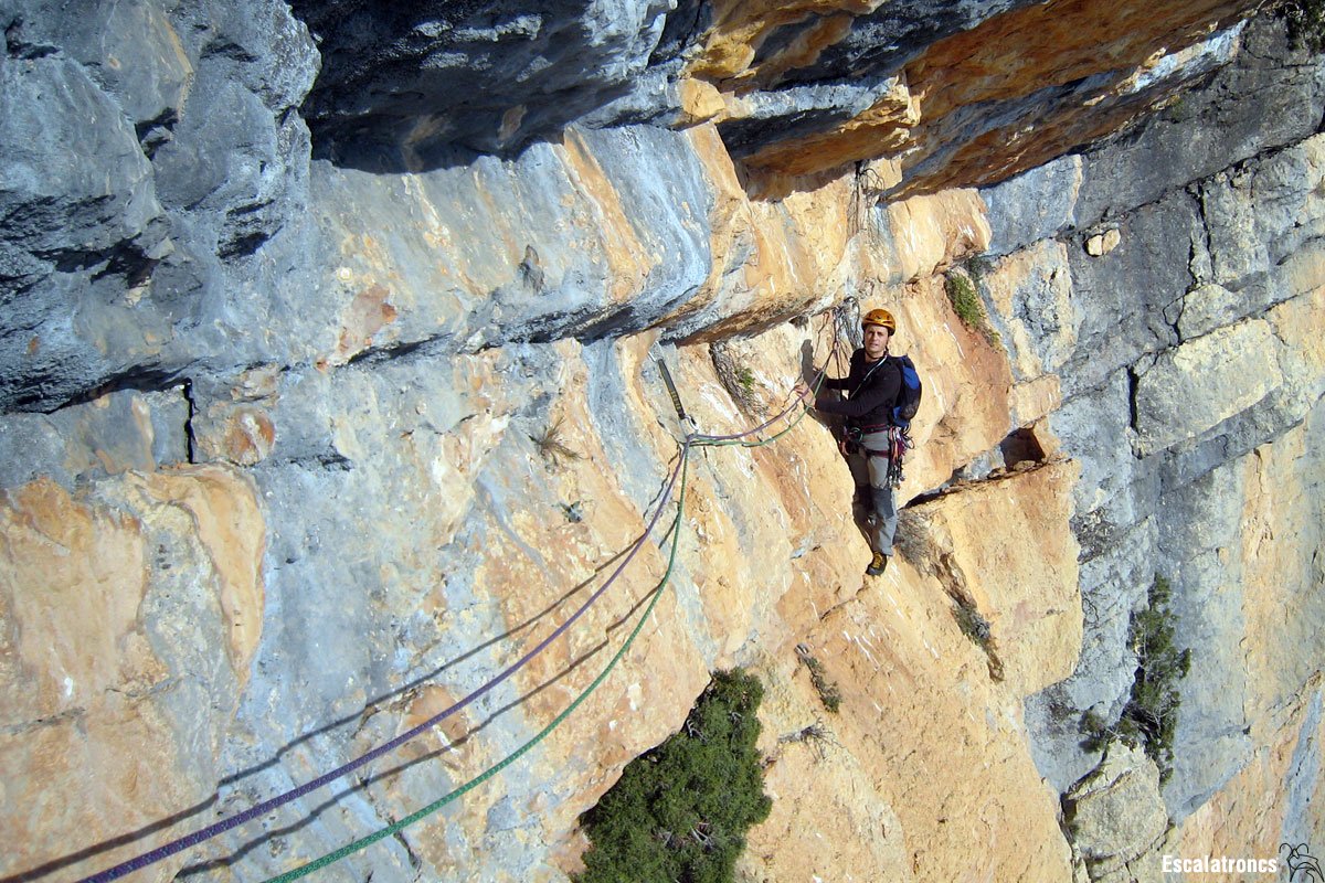 Sortim per sobre d’un bloc amb un pas atlètic i arribem sota el sostre. Aquí trobem un parell de claus que ens asseguren el flanqueig fins la reunió. Per aquesta tirada necessitarem un parell de friends dels números 1 i 2. 25 metres