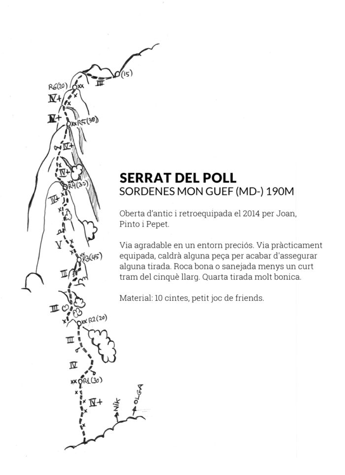 La Sordenes Mon Guef és un itinerari que ja havia estat obert d’antuvi i ara s’ha retroequipat pel gaudi del personal. Amb una quarta tirada realment bonica la via segueix la lògica de la “banya” esquerra del Serrat. Hi trobarem una escalada bàsicament en placa, tallada per l’inevitable feixa i per les petites vires que van fent els plecs que confegeixen aquesta paret. La roca és bona en general, i quan no, està sanejada.
