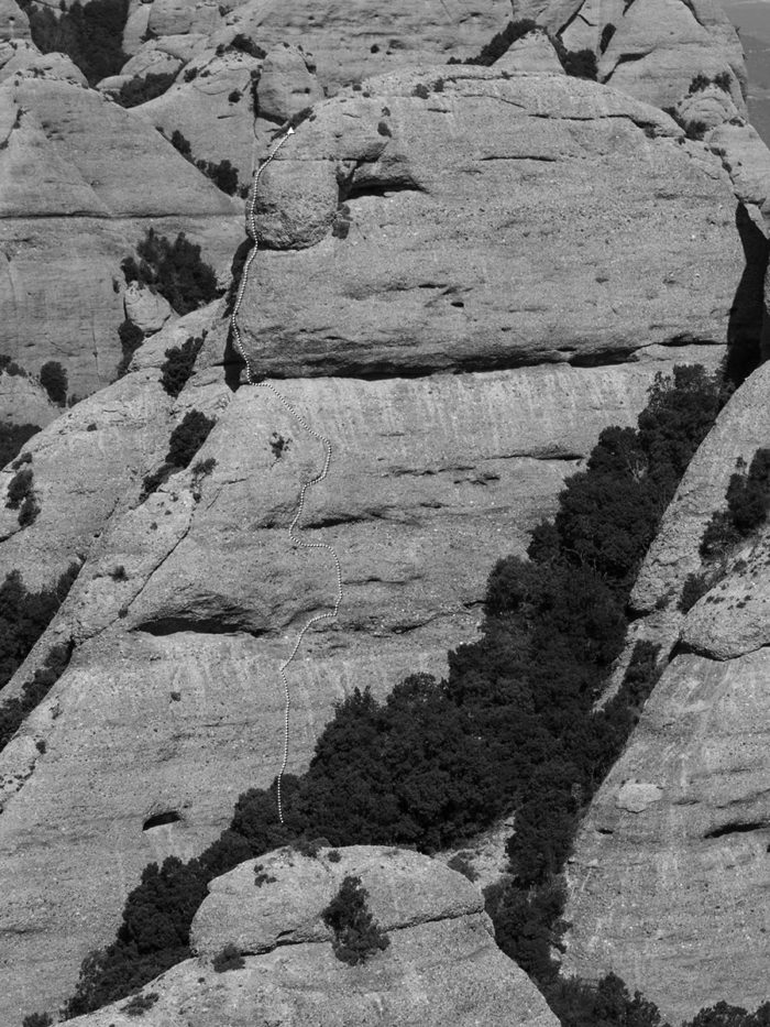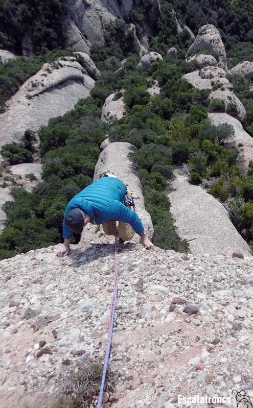 Ruta intel·ligent, més difícil del que sembla sobre el paper. Al primer llarg trobarem els trams més obligats, amb un pas de decisió per caçar el primer pont de roca. Aquests, tot i estar passats amb bagues gruixudes mola reforçar-los. A la fissura hi podrem emplaçar algun friend.