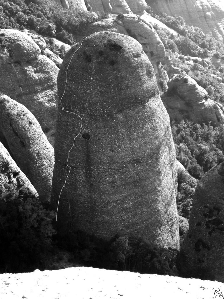 La via s’inicia al coll Nord del Dit, un metre a l’esquerra d’un arbre sec. Hem de buscar el camí més natural fins un primer llavi, on trobarem un clau bo i al costat un cap de burí. Des d’aquest punt flaquegem cap a l’esquerra fins trobar el pas i continuem uns metres verticals amb bona presa (es pot llaçar un merlet bo). Passat un pa de terra característic hi ha un burí xafat (al costat entra un Camalot #1 a caldo). Des d’aquest punt fem una marrada a l’esquerra fins un topi blanc molt característic que indica per on hem d’enfilar cap al cim (pas extraplomat amb ganda). Les possibilitats d’auto-assegurar-se són mínimes i les caigudes potencialment perilloses.