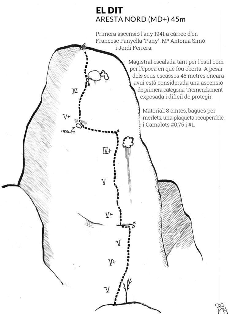 La via s’inicia al coll Nord del Dit, un metre a l’esquerra d’un arbre sec. Hem de buscar el camí més natural fins un primer llavi, on trobarem un clau bo i al costat un cap de burí. Des d’aquest punt flaquegem cap a l’esquerra fins trobar el pas i continuem uns metres verticals amb bona presa (es pot llaçar un merlet bo). Passat un pa de terra característic hi ha un burí xafat (al costat entra un Camalot #1 a caldo). Des d’aquest punt fem una marrada a l’esquerra fins un topi blanc molt característic que indica per on hem d’enfilar cap al cim (pas extraplomat amb ganda). Les possibilitats d’auto-assegurar-se són mínimes i les caigudes potencialment perilloses.