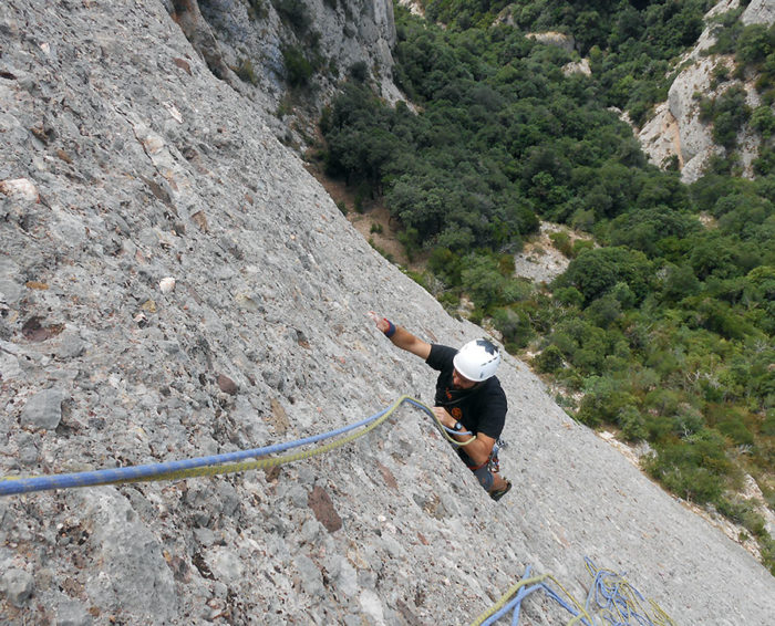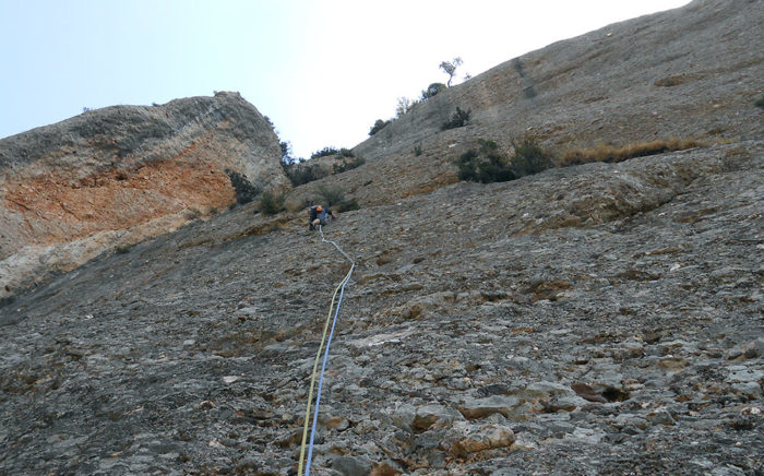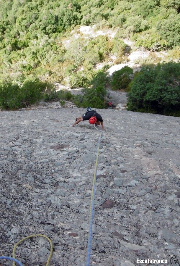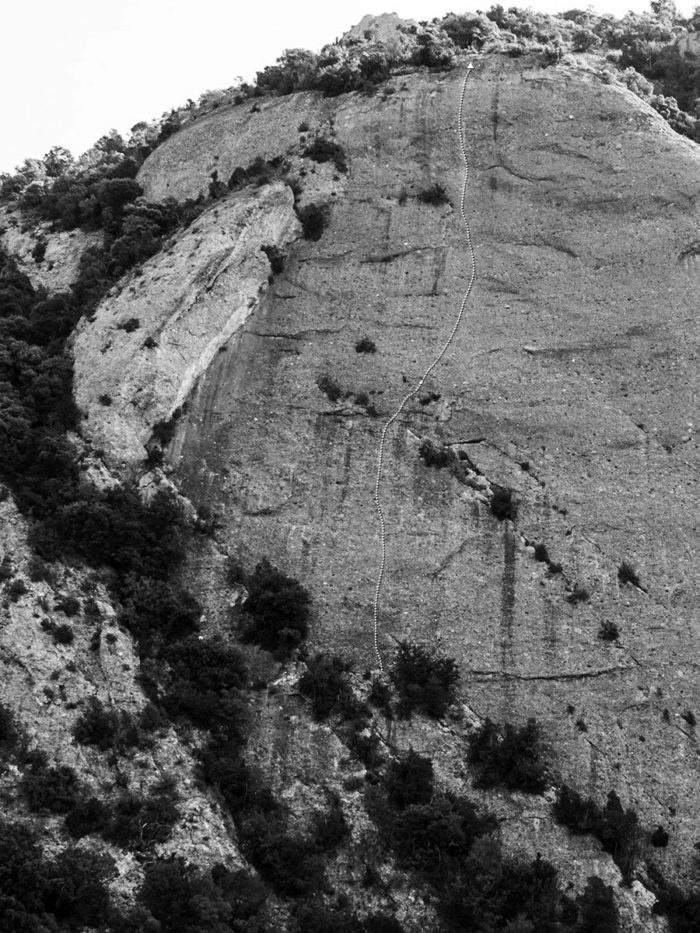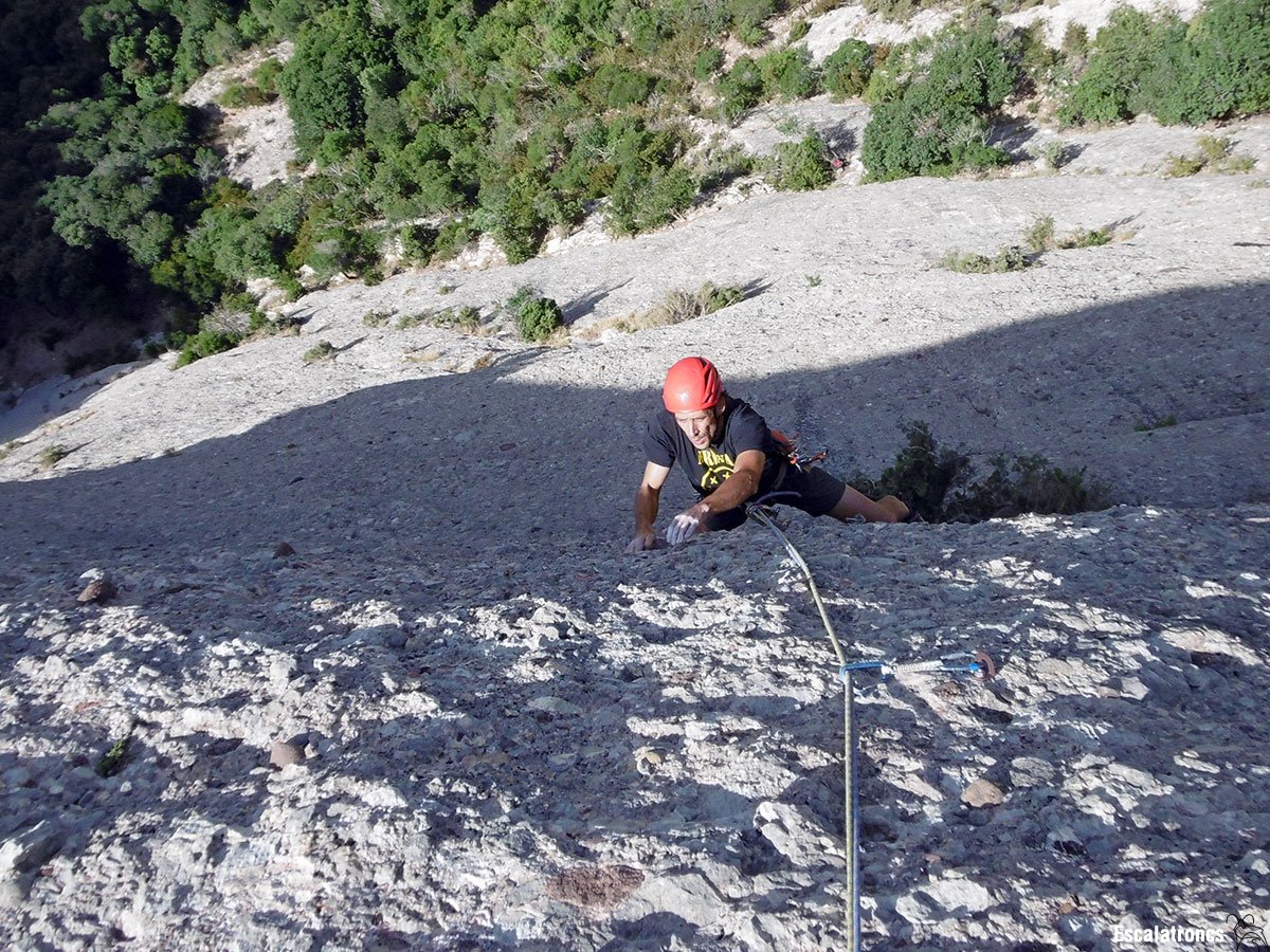 La via es troba totalment equipada amb parabolts, tot i que aquests no estan a tocar, excepte la darrera tirada. La via va agafant empenta a mida que ens elevem, fins arribar a l’elegant darrer llarg: un llaminer mur de forats.