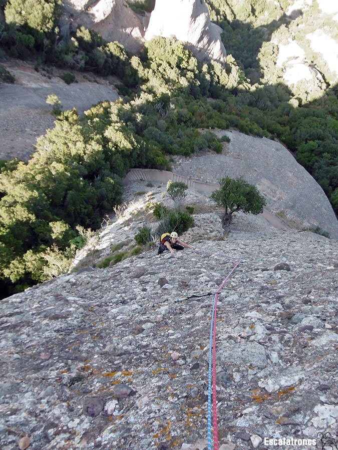 La primera tirada és l’única que presenta un rocam discret, la reunió la farem aprofitant una bona alzina. A partir d’aquí la roca és excel·lent i l’ambient de primera.