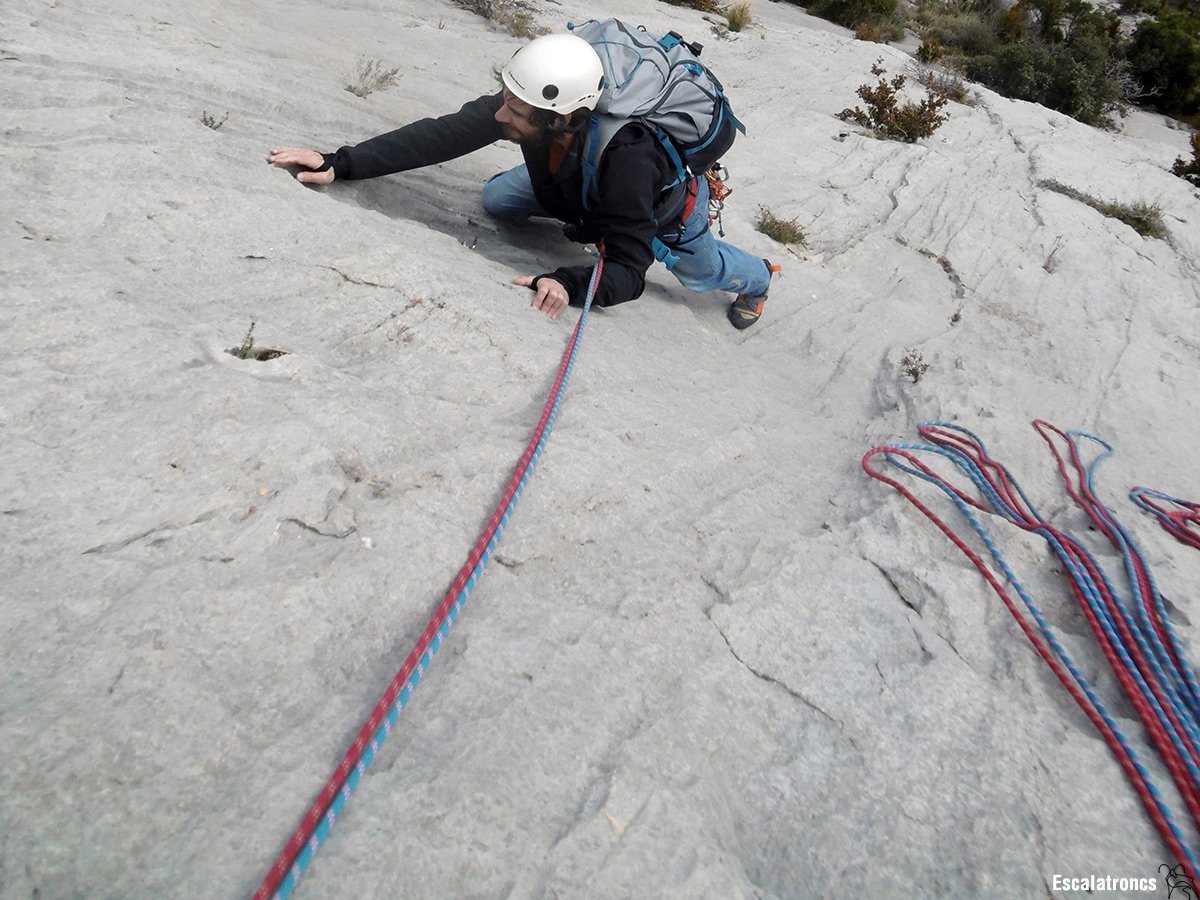 Destaquen per boniques les dos darreres tirades, que travessen la gran placa de baix a dalt. Tocarà escalar en adherència i emplaçar alguna peça. Per si sols aquests dos llargs ja valen la pena.