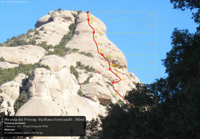 De la Miranda el Pas del Príncep en destaca l’espectacular vista que ens trobem quan arribem al cim: Agulles al fons, Frares en primer terme i tota la Serra de les Saleres a l’altra banda. La via Blava és una variant d’entrada de la via Dori. Es tracta d’una escalada senzilla, que concentra les màximes dificultats a les sortides de les reunions. A l’hivern toca el sol fins ben entrada la tarda.