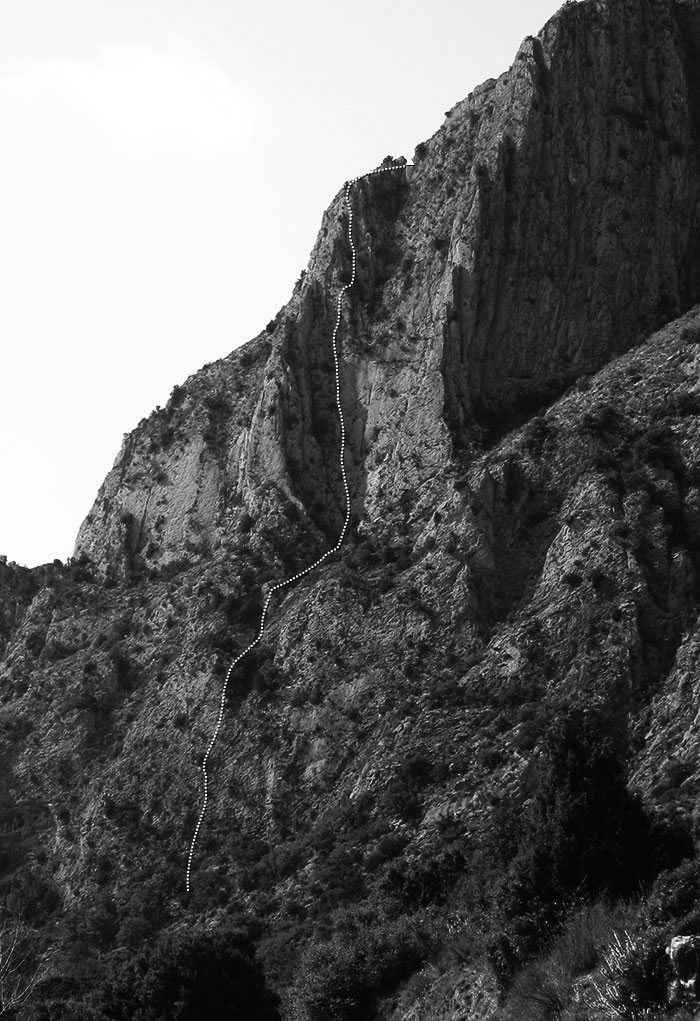 Però és després de la feixa on trobem els llargs de corda més interessants. Bonica escalada bàsicament en placa, amb cert ambient i verticalitat. També podem empalmar tirades sense patir. La via s’escala ràpidament i amb el que hi ha posat, tot i que podem afegir més peces a discreció, la paret ho permet.