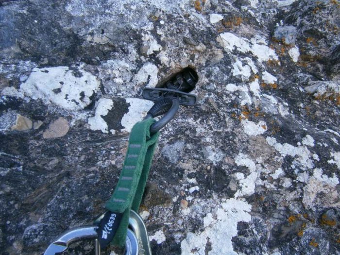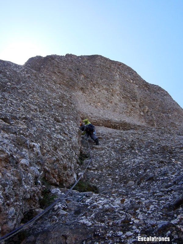 El primer llarg serveix per situar-nos al llom de l’aresta. El segon és una petita joia, roca exel·lent en un mar de còdols cantelluts que ens ajuden a progressar amb tota tranquil·litat. Trobem un espit a mitja tirada i podrem llaçar algun merlet.