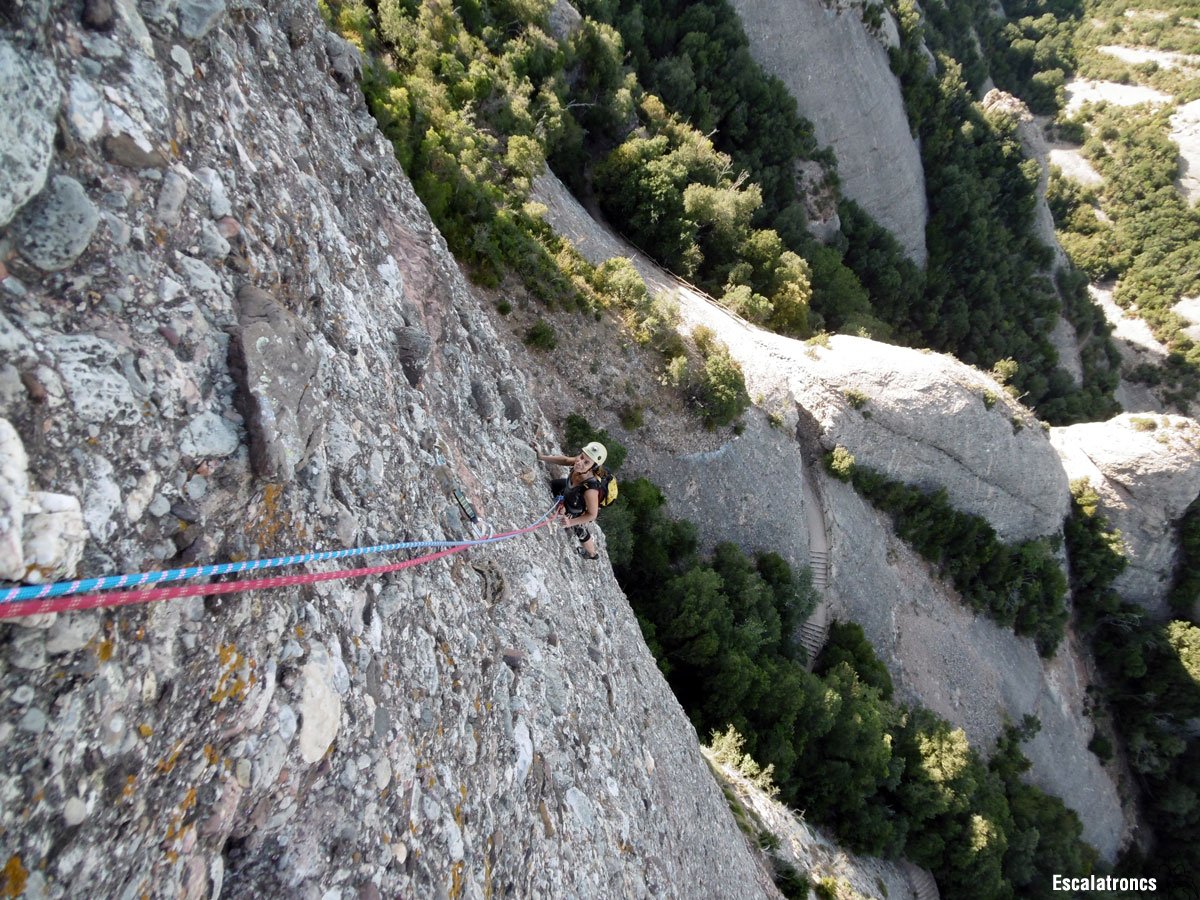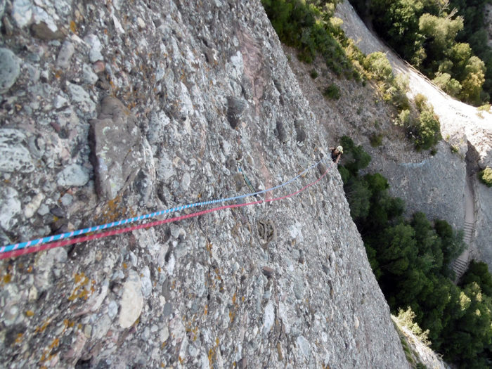 La primera tirada és l’única que presenta un rocam discret, la reunió la farem aprofitant una bona alzina. A partir d’aquí la roca és excel·lent i l’ambient de primera.