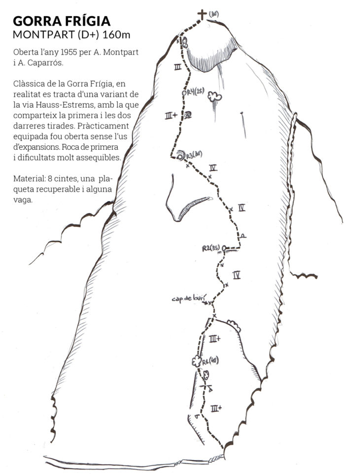 La Montpart és una de les vies més clàssiques de la concorregut Gorro Frigi. Tot i aquesta etiqueta és un itinerari que es repeteix esporàdicament malgrat la baixa dificultat i la bona qualitat del rocam, i és que el personal prefereix les autopistes de parabolts que l’envolten i en algun punt la trepitgen descaradament.