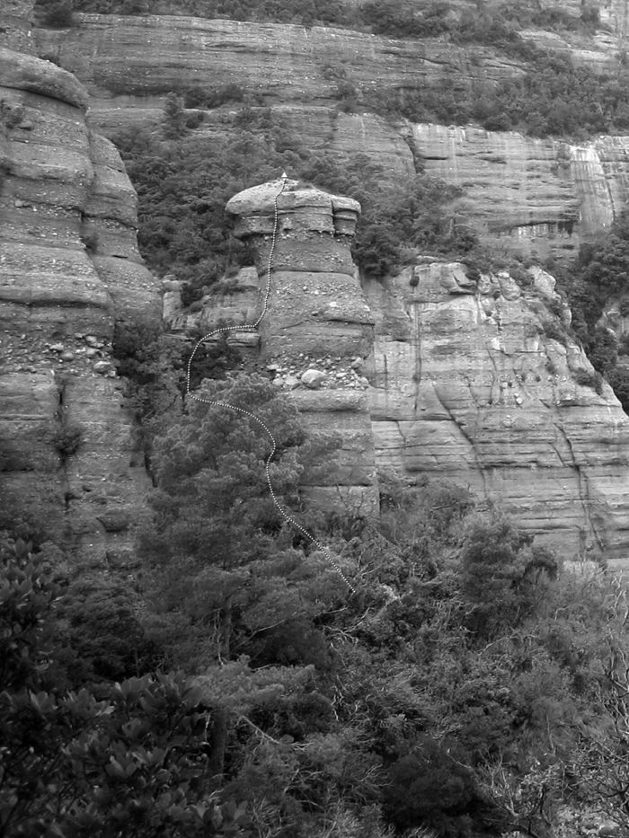 Accedir a la base de la paret és un dels punts més complicats doncs la bardissa ho envaeix tot. Un cop davant la paret ataquem una fissura fins a un pont de roca i d’allà cap a l’alzina on fem la reunió. La segona tirada l’iniciem abastint el coll que separa el Bolet de la Cinglera del Bolet. A partir d’aquest punt l’escalada esdevé vertical, de passos precisos fins a arribar a un clau estratègic. Per abastir el cim haurem de superar un curt tram un pèl balmat.