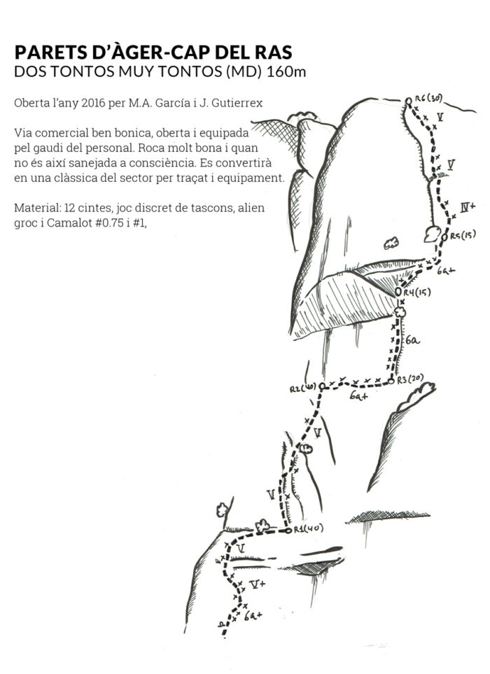 Equipada pel gaudi del personal, amb roca boníssima i si no sanejada a consciència, la Dos Tontos Muy Tontos de ben segur que ja és de les vies més repetides a Àger. Amb un traçat encertat, brinda 5 tirades rodones, on podrem posar en pràctica una gran varietat de tècniques d’escalda: adherències, diedres, fissures, extra ploms… I tot amb una assegurança prou a prop per no patir en cap moment.