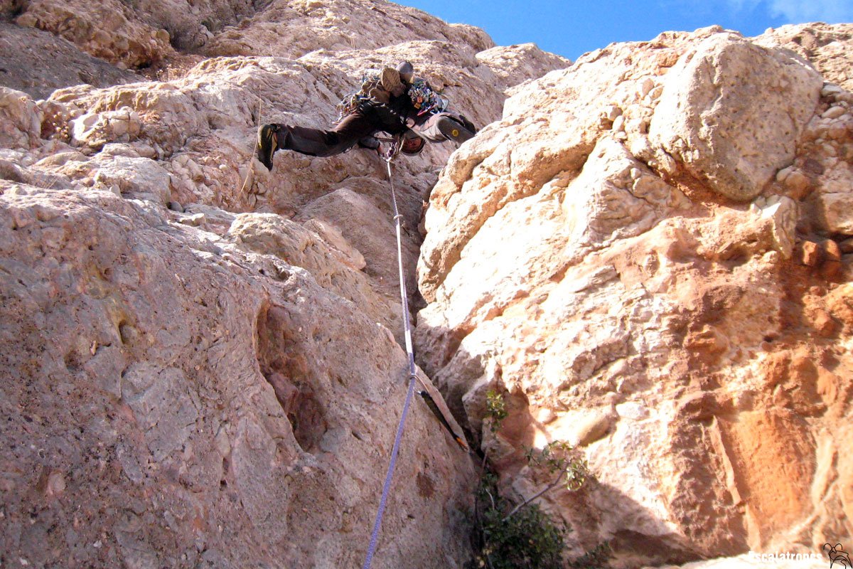 Des de la reunió veiem el magnífic diedre pel que transcorre aquesta tirada, tot just a l’esquerra del sostret; per atènyer el diedre primer haurem de situar-nos sobre un pedestal que hi ha a la banda esquerra d’aquest. Trobarem molt bona pressa. Un cop sobre del relleix ataquem el diedre sense contemplacions.  El diedre és travessat per una fissura que admet friends i tascons, a demés trobarem un pont de roca que podem equipar. Quan la fissura es torna cega podem seguir per la placa de la dreta fins una lleixa on hi trobarem una instal·lació de ràpel. Seguim pel diedre, ara no tant perfecte i amb algun còdol sospitós. Superem un darrer ressalt buscant la millor posició i arribem a la reunió. 30 metres.