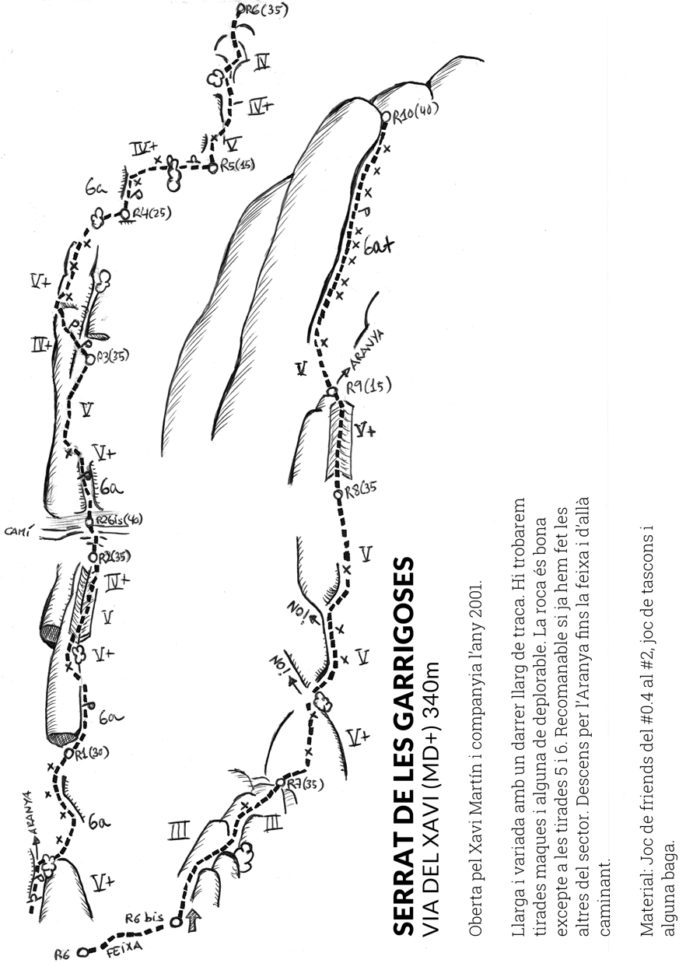 Malgrat l’inevitable discontinuïtat de la paret, la del Xavi pot presumir de ser una de les rutes més mantingudes en V+ del sector, amb un darrer llarg de traca i mocador. Llarga i variada hi trobarem alguna tirada cutre altrament indefugible sabent on som. Un joc de friends serà suficient per afrontar aquesta ascensió, recomanable si ja hem fet les altres del sector.