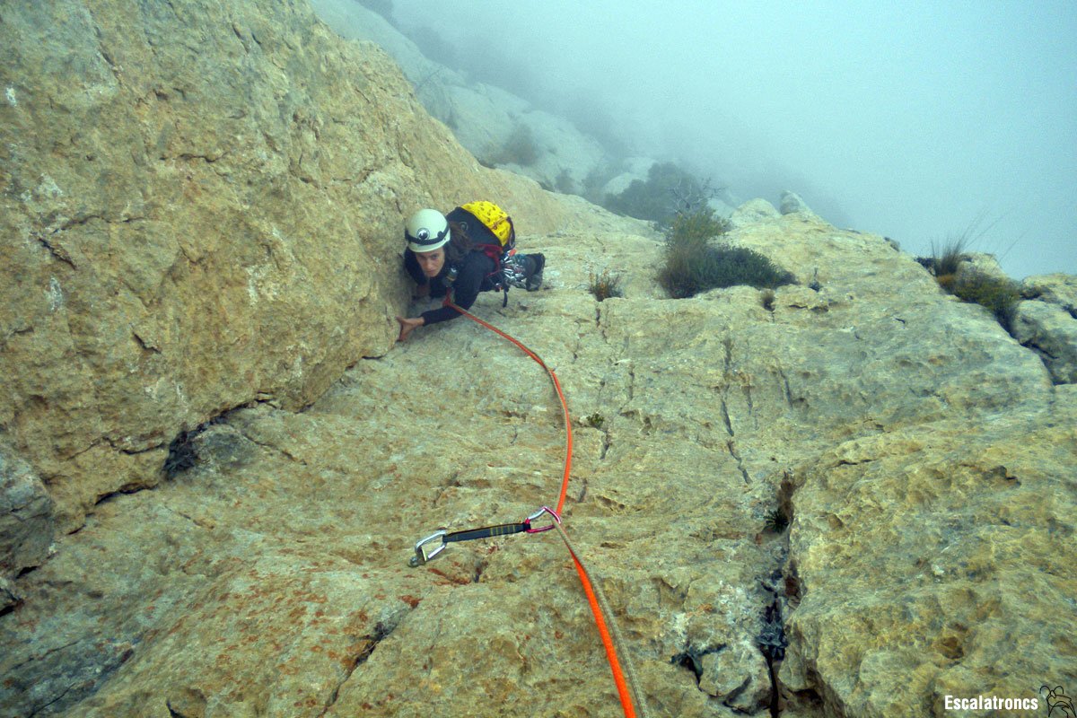 Escalem uns primers metres drets i amb bona presa fins que podem iniciar un bonic flanqueig cap a la dreta (una bona presa lateral ens ajudarà) seguim un pèl més a la dreta per seguir pel fil de l’esperó en escalada aèria fins que, ràpidament, la verticalitat disminueix. Encara ens restaran uns quants metres sobre unes agradables plaques inclinades abans d’arribar a la darrera reunió. 30 metres, 5 parabolts.
