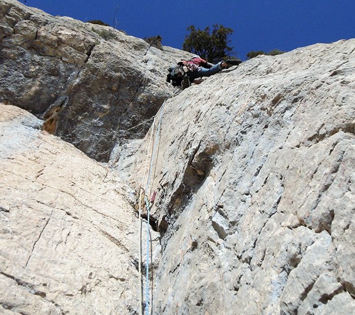 La part més compromesa la trobarem a l’inici cel cinquè llarg de corda, on la protecció es fa difícil abans de caçar l’únic clau de la tirada que protegeix el pas de 6a+.