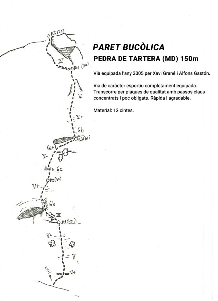 A la banda esquerra de la Paret Bucòlica trobem aquest interessant itinerari de caràcter esportiu. 5 tirades generosament equipades sobre roca de primera qualitat, transcorren majoritàriament per plaques de qualitat amb passos claus concentrats i poc obligats. Molt ràpida i agradable d’escalar.