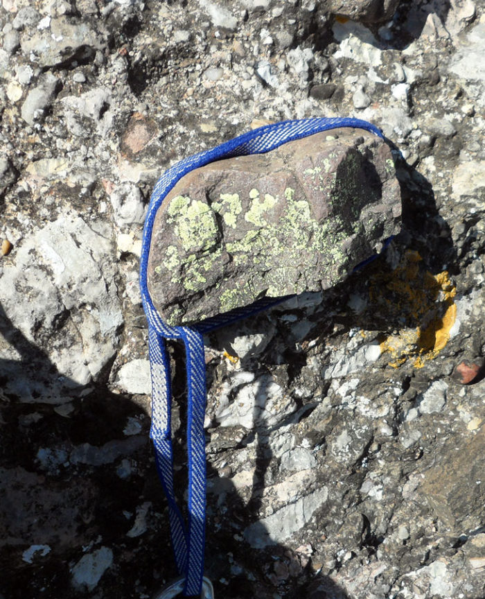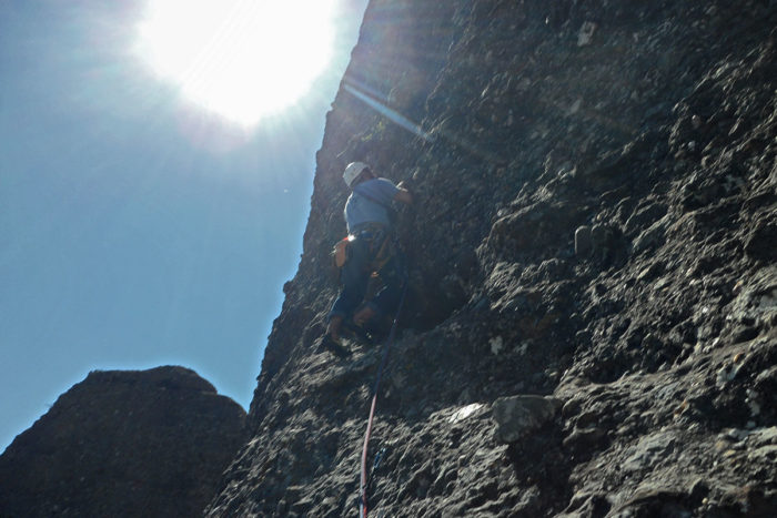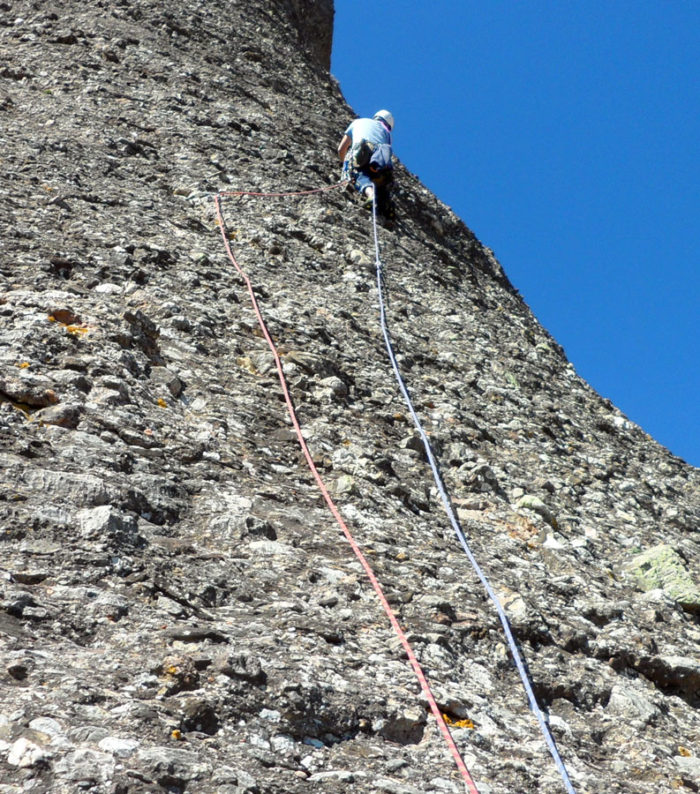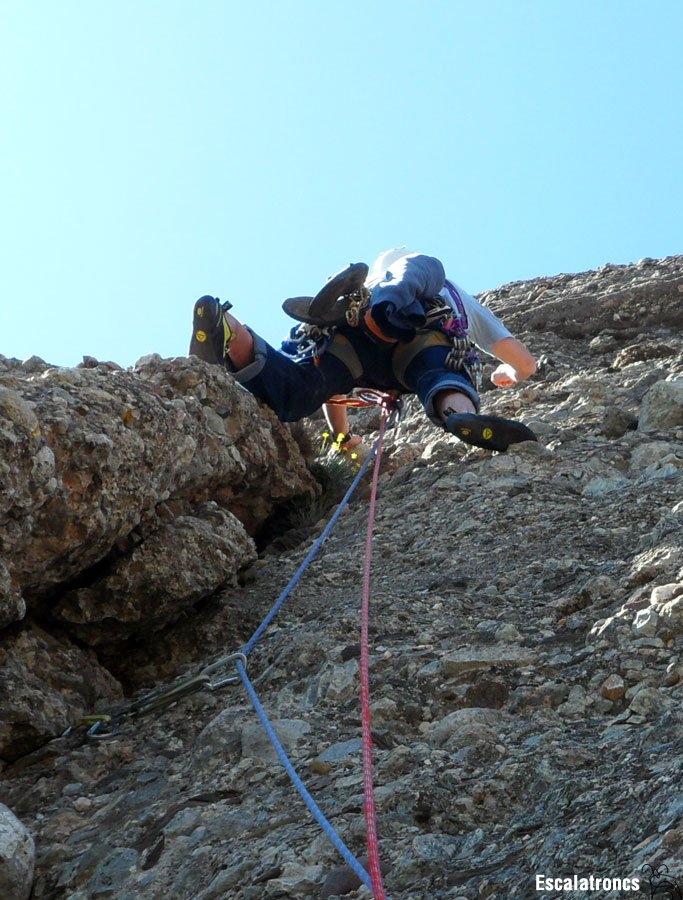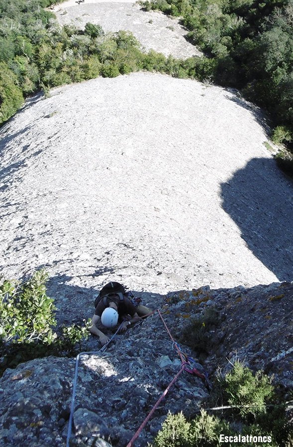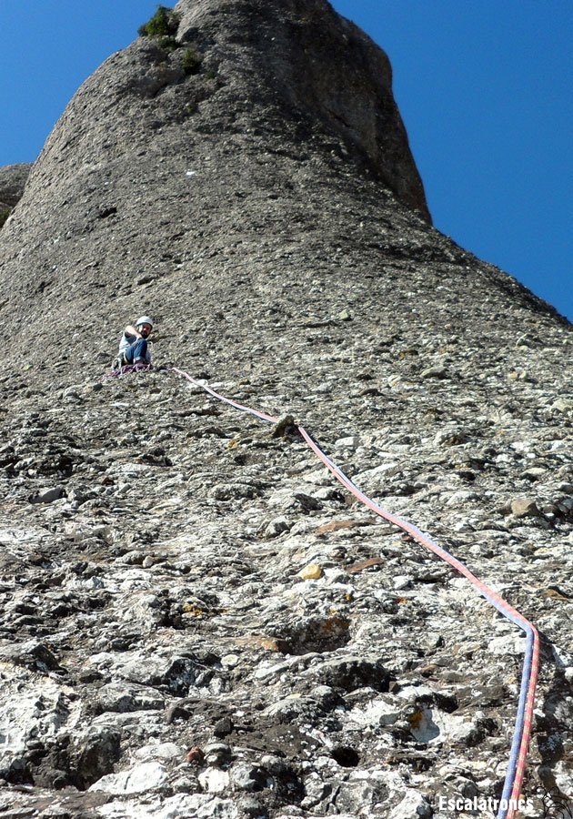 La darrera tirada ressegueix el diedre que fa la llastra característica d’aquesta part del monòlit. Un cop enfilats al damunt atacarem el darrer tram, una placa molt vertical on trobarem un burí i dos espits.