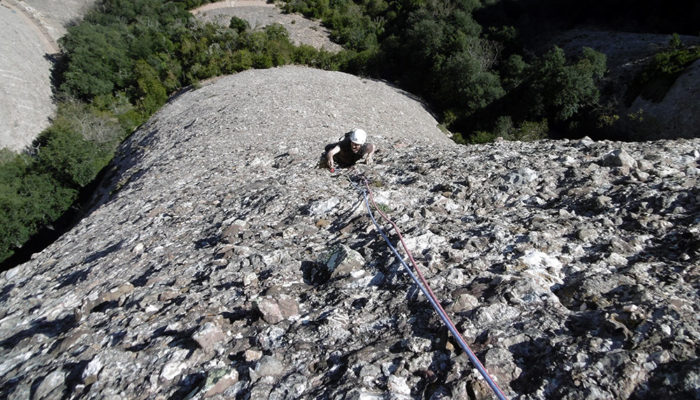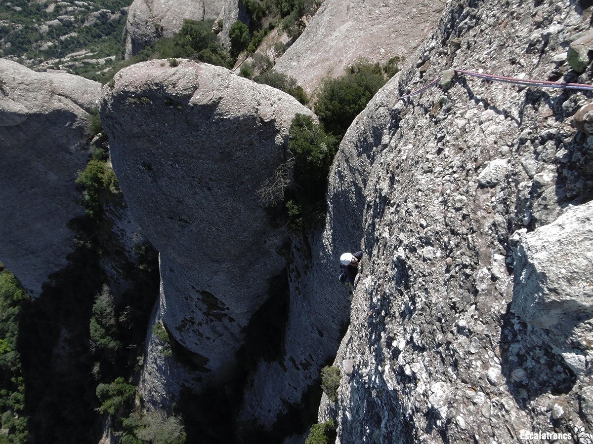 La primera tirada està totalment trepitjada per la Ignasi Jorbà, tot i que la reunió la fem a la via original, fàcilment localitzable per estar al costat d’un còdol característic.