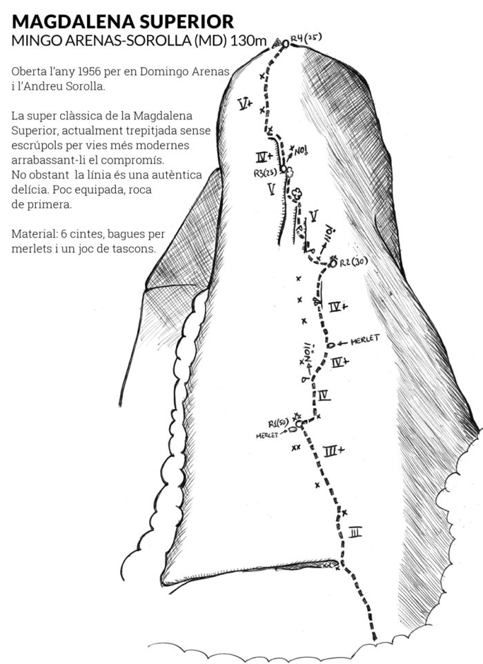 La Mingo Arenas-Sorolla de la Magdalena Superior és més coneguda com la Canaletes pel tram de la tercera tirada on s’ha de travessar un característic sistema de fissures fins enfilar-ne la darrera, que mena recte amunt a la quarta reunió. Es tractava d’una via de prestigi, oberta per dos dels escaladors més destacats de l’època, amb un grau de compromís gens menyspreable.