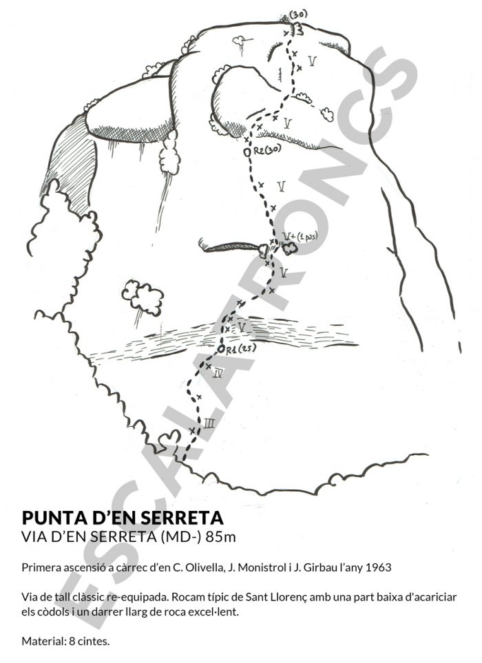 La via d’en Serreta és un petit itinerari de tall clàssic re equipat. S’enfila per un llaminer pany, amb la gràcia d’acabar pràcticament al capdamunt de la Mola. La roca és la típica de la contrada, discreta a la part inferior i excel·lent al darrer llarg de corda, sens dubte el més escalador. Per repetir-la només caldran cintes i acaronar bé els còdols a la part inferior.