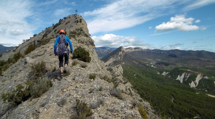 La via és rapelable, no obstant nosaltres vam baixar caminant. Per fer-ho hem de crestejar fins arribar a la creu. Des de la creu prenem un corriol que baixa pel vessant nord i que al cap d’una estona ens torna a deixar a la cresta. Des d’aquest punt marxem cap a l’oest a mitja paret; anirem trobant marques blaves que fent ziga-zagues van descendint pel vessant sud fins arribar a la carretera.