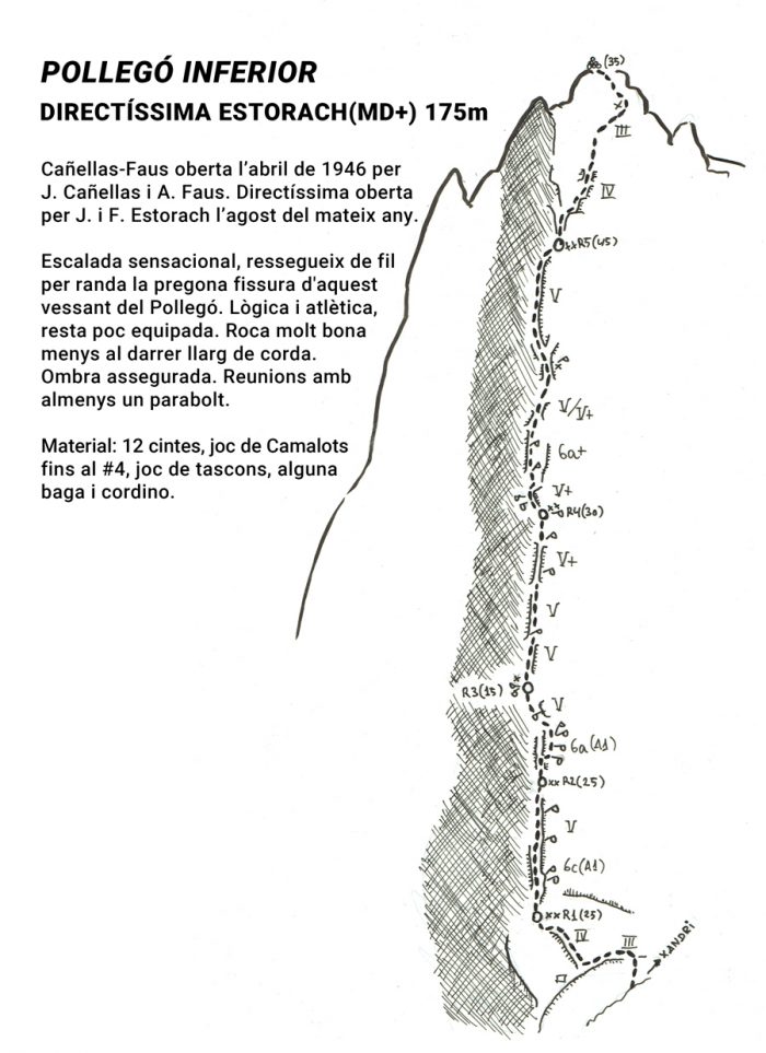 A les beceroles de l’escalada al nostre país hi destaquen per audaces les primeres dels germans Estorach. Malgrat que la Directíssima Estorach al Pollegó Inferior és una variant de la Cañellas-Faus, oberta uns mesos abans, arrodoneix el traçat dotant-lo de la contundència que el fa avançat a la seva època, esdevenint així un bon repte encara avui en dia. Via de fissures, ressegueix fil per randa l’esquerda més evident d’aquest vessant, com no podia ser d’altra manera.