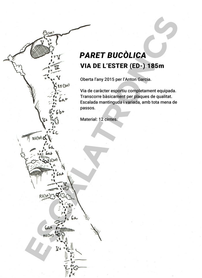La via de l’Ester és de les darreres vies obertes a la Paret Bucòlica. Situada tot just a la dreta de la repetida Pas d’Estrès esdevé una bona alternativa d’aquesta amb un punt més de dificultat en conjunt. De caràcter esportiu roman completament equipada amb parabolts.