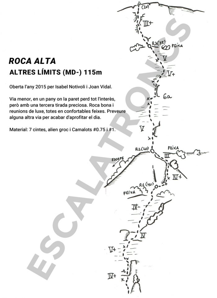 L’Altres Límits transcorre per la part més oriental i alhora menys atractiva de la paret principal de la Roca Alta. Així i tot trobarem unes boniques primera i tercera tirades, ambdues plaques sobre roca de primera qualitat.