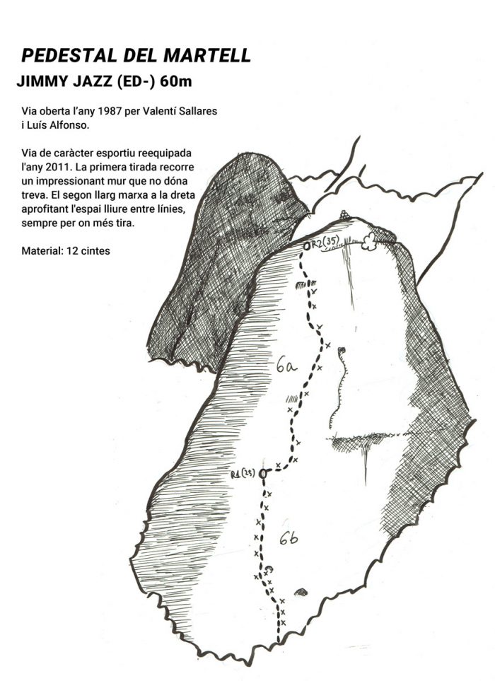 A la Jimmy Jazz i trobem això, cigronets, còdol més aviat petit, verticalitat i bona roca, amb alguna crosteta per donar-hi emoció. La via, equipada amb esperit esportiu, va ser restaurada l’any 2011 oferint una escalada segura, mantinguda i obligada fins al 6a.