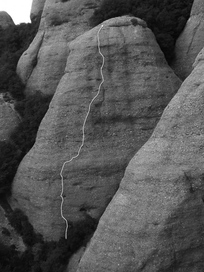 El primer llarg de corda comença rabiós i mantingut, navegant per una excel·lent planxa de conglomerat, un pèl desplomat en algun punt.