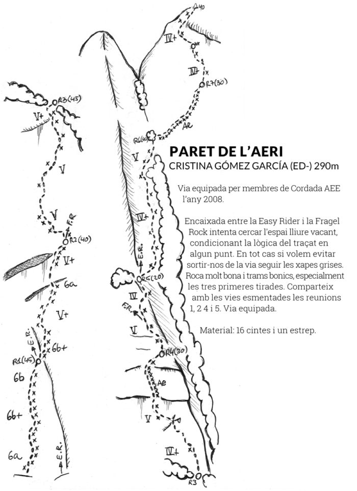 Deixem el vehicle a l’aparcament del Refugi de Santa Cecília i prenem el camí de l’Arrel direcció al Monestir fins la canal de l’Aeri. La remuntem fins arribar al final, on comença la via, per una marcada fissura.