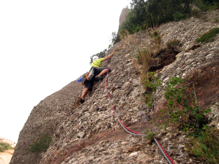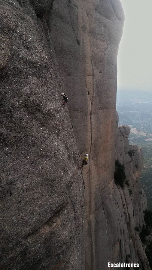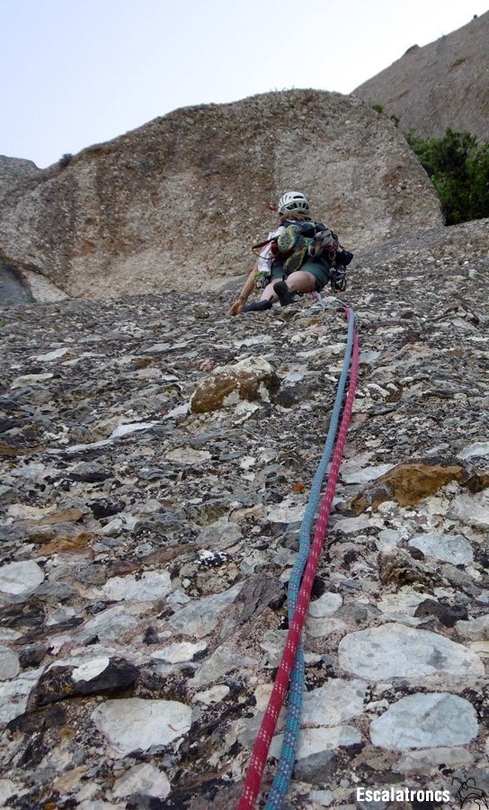 Escalada bàsicament en placa, on hi destaca el primer llarg, tècnic i el segon, amb roca de primera. Després es qüestió d’anar seguint les xapes grises. Als trams d’artificial les assegurances estan força properes. Ràpida i amb ombra a partir de les 13:00 hores.
