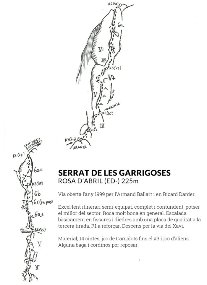 La Rosa d’Abril és potser la millor via del sector. Escalada contundent i completa, sobre roca de qualitat, encerta una línia 100% convincent on es succeeixen els trams fissurats i diedres amb alguna placa esporàdica de primera categoria. L’única cosa que li treu continuïtat és l’inevitable feixa que parteix totes les vies que s’enfilen al capdamunt del Serrat.