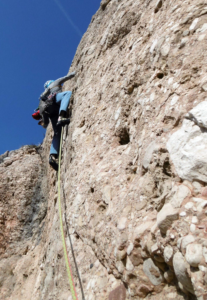 Per sobre de la feixa es comparteix una tirada amb l’Aranya per continuar recte per un evident diedre. A la part superior, on la roca empitjora, trobarem un tram exposat.