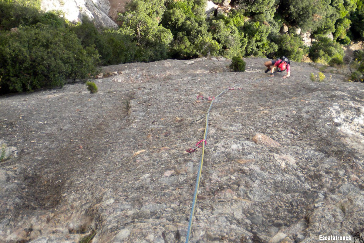 Iniciem la tirada sortint de la reunió en diagonal cap a la dreta, seguint la filera d’expansions -que en aquest llarg són especialment nombroses- a través d’una deliciosa placa. A mitja tirada trobarem el pas clau de la via (molt ben protegit) on la mida i la disposició de les preses no és tant evident com a la resta de la via. Un cop superat el pas ens resten uns agradables metres fins la quarta reunió. 30 metres.