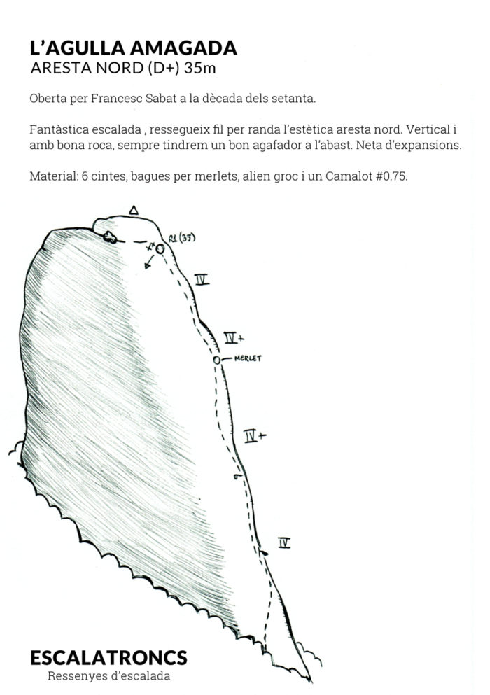 Per l’estètic caire nord de l’agulla s’hi enfila una petita gran escalada. Vertical i amb bons agafadors esdevé un itinerari entusiasmant net d’expansions, on toca deixar-se guiar per les sensacions, zigzaguejar per la fina aresta i cercar la lògica.