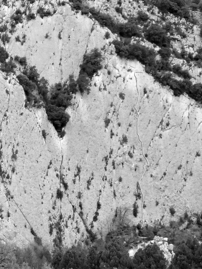 Via on caldrà protegir-nos aprofitant les anfractuositats del terreny per on transcorre. Totes les tirades són mantingudes en V+ amb algun pas puntual una mica més picant.