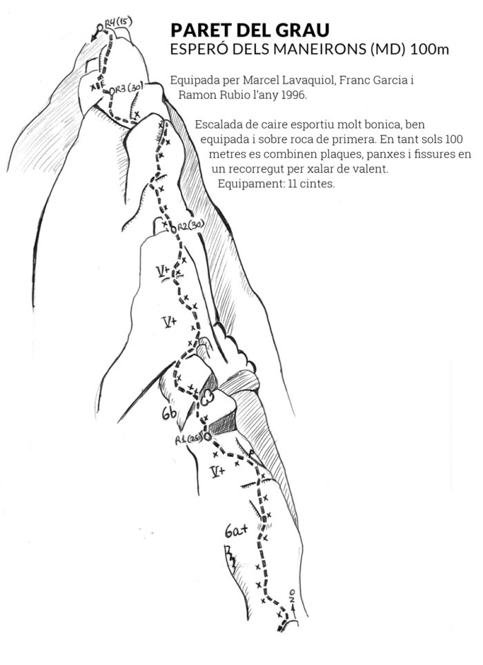 Situada a la Paret del Grau (Coll de Nargó) l’Esperó dels Maneirons és una opció del tot recomanable. Amb un equipament de caire esportiu, només ens caldran les cintes per superar les quatre tirades que conformen la via. L’itinerari, sobre roca excel·lent és sostingut, variat i ràpid, fent-nos escalar plaques, fissures i panxes. Com a curiositat dir que l’inici de la via és sobre conglomerat  que amb els metres es va transformant en un calcari de primera qualitat. Donada la seva curta llargada la podrem combinar fàcilment amb altres vies de la mateixa paret.