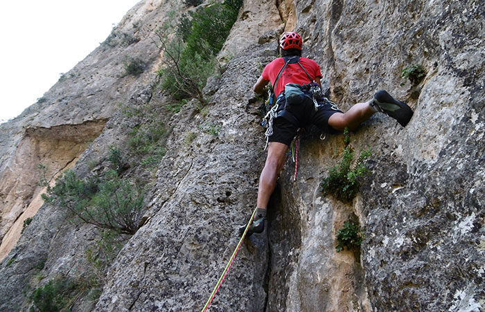 La primera tirada té un tram de placa abans d’arribar a la reunió que deu ni do, sense ser extrem t’hi has d’aplicar. En canvi, el segon llarg tot i semblar un rostoll des de la reunió és prou sofert, sens dubte el més fàcil de la via.