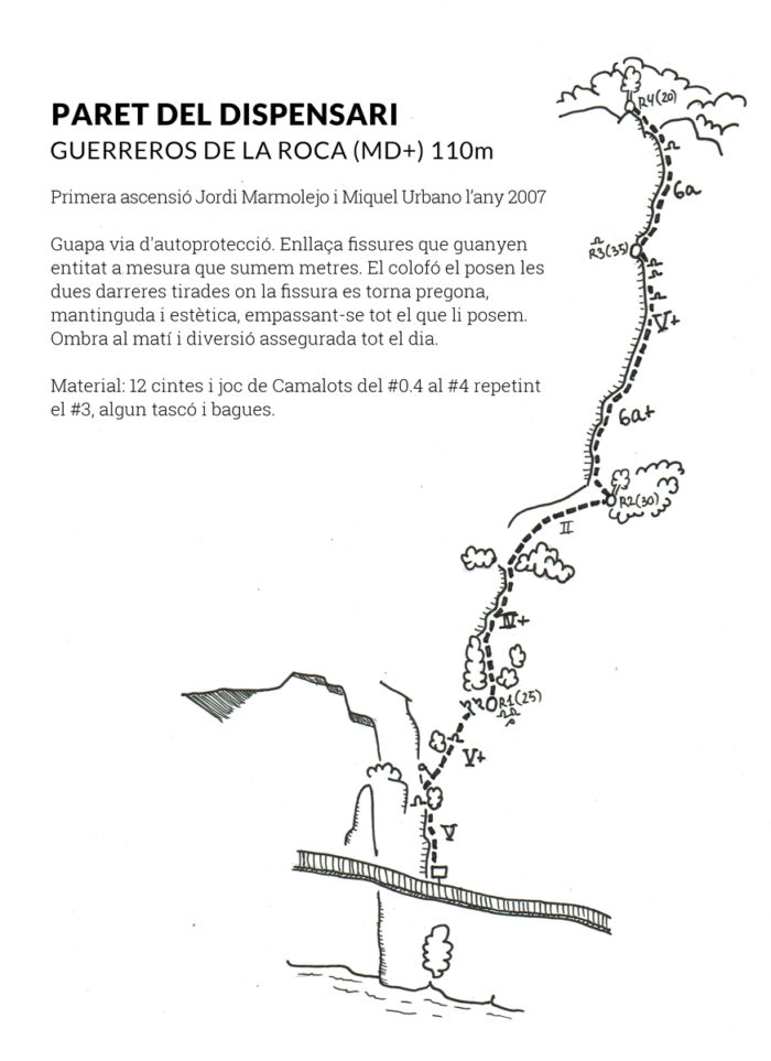 La Guerreros de la Roca és un regal de via pels qui gaudeixin fent anar la ferralla. Tota ella en fissura menys uns pocs metres de la primera tirada, esdevé el terreny de joc ideal per l’autoprotecció. La via va de menys a més, amb les dues darreres tirades de traca, amb una fissura pregona, mantinguda i estètica, tot un luxe.