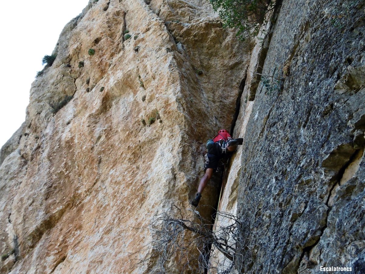 Un cop superades les dues primeres tirades, arribem al tram clau de la via, una esplèndida fissura de 50 metres, bastant ampla, que ens mena al capdamunt de la paret. Per afrontar la tirada amb garanties anirà bé anar assortits en friends de números grans. Per exemple repetir el #3 de Camalot i portar un #4, que és el que hem fet servir nosaltres, tot i que si en portem més els posarem segur.