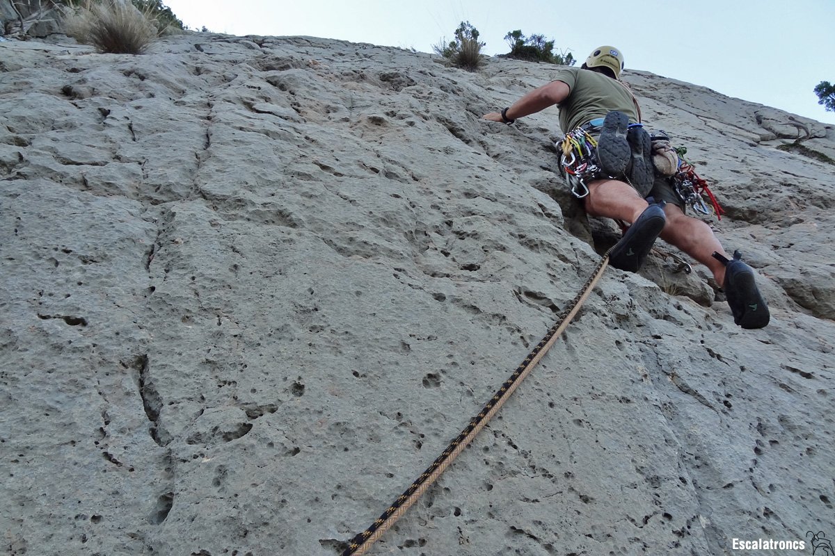 La via es composa de dues tirades, la primera més difícil, sobretot pel desencertat emplaçament de les assegurances. El segon llarg per contra, transcorre per plaques compactes molt agradables d’escalar. Pel primer llarg podem portar alguna baga savinera que servirà per no tocar el terra si fallem abans del primer bolt.