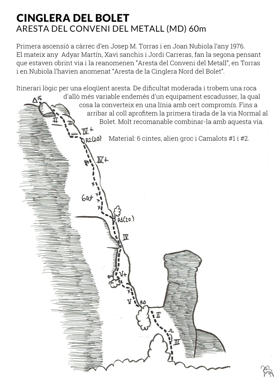 A la banda nord de la Cinglera del Bolet s’hi dibuixa mi rant a l’estrambòtic pinacle del Bolet una llaminera aresta. Escalada per primera vegada pels incombustibles Torras i Nubiola fou reoberta i rebatejada per un grup de sabadellencs que li donaren el nom que ha restat fins ara.