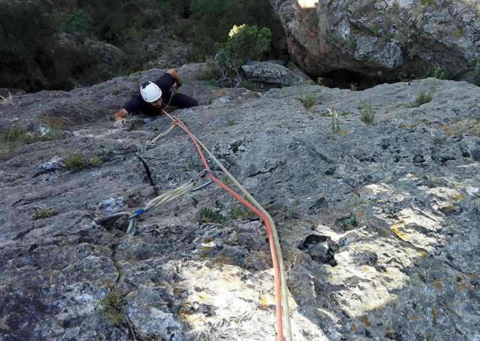 Si rapelem aterrem directament al coll, on comença la via EUSAM. Una primera secció de fissura més contundent totalment equipada amb espits ens deixa al peu del mur final, perfectament fissurat, permetent-nos una bona autoprotecció.