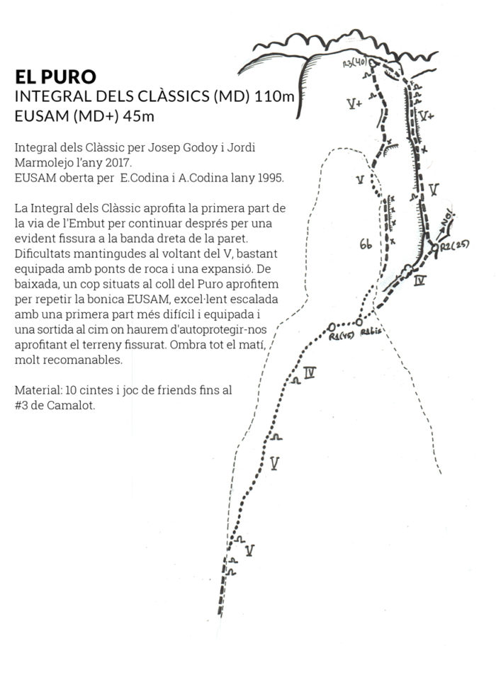 Bona proposta per als dies més calorosos de l’any. La Integral dels clàssics aprofita la primera part de la via de l’Embut per arribar fins a la part superior del coll que forma el Puro amb la paret. Des d’allà marxa a dretes per encertar una bonica fissura que ens mena al capdamunt de la paret. De baixada aterrem de nou al coll, on aprofitem per fer la bonica EUSAM, una tirada genial, amb una primera part més contundent però equipada i una secció final d’autoprotecció sobre terreny fissurat. En definitiva, una combinació del tot recomanable per amagar-nos del sol quan aquest no perdona.
