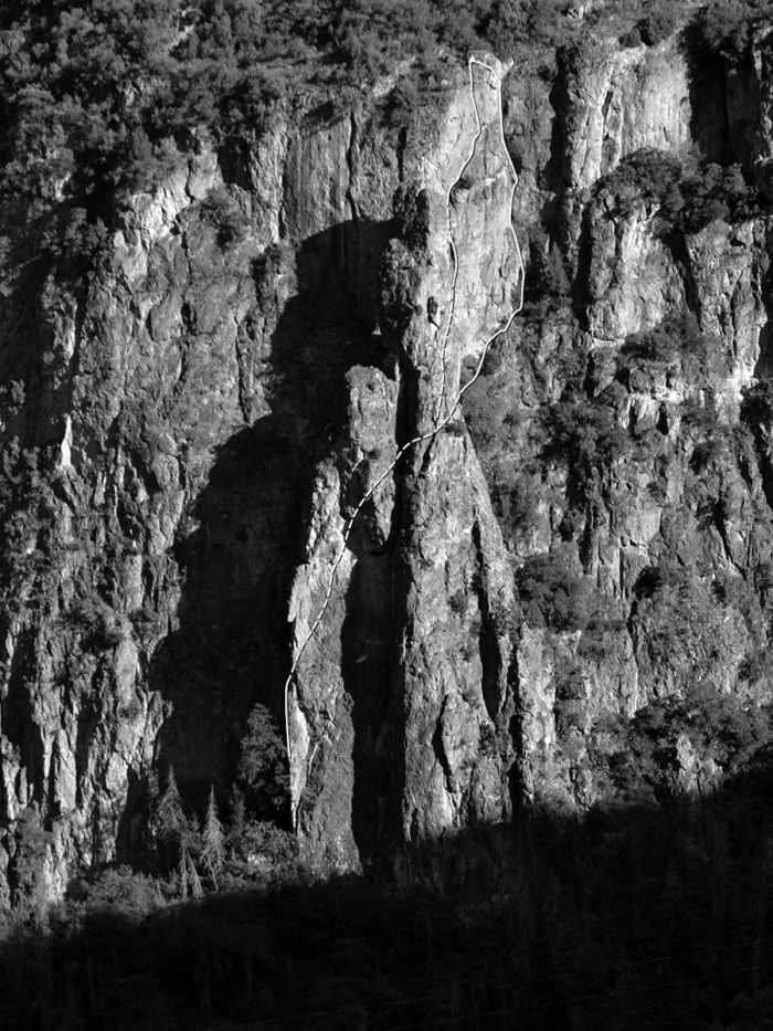 Com hem comentat la integral s’inicia per la Via de l’Embut, bàsicament en xemeneia, on a més hi trobarem alguns bons ponts de roca. Des del coll marxa a buscar amb una tirada de tràmit una bonica fissura que ressegueix fil per randa fins a sortir de la paret.